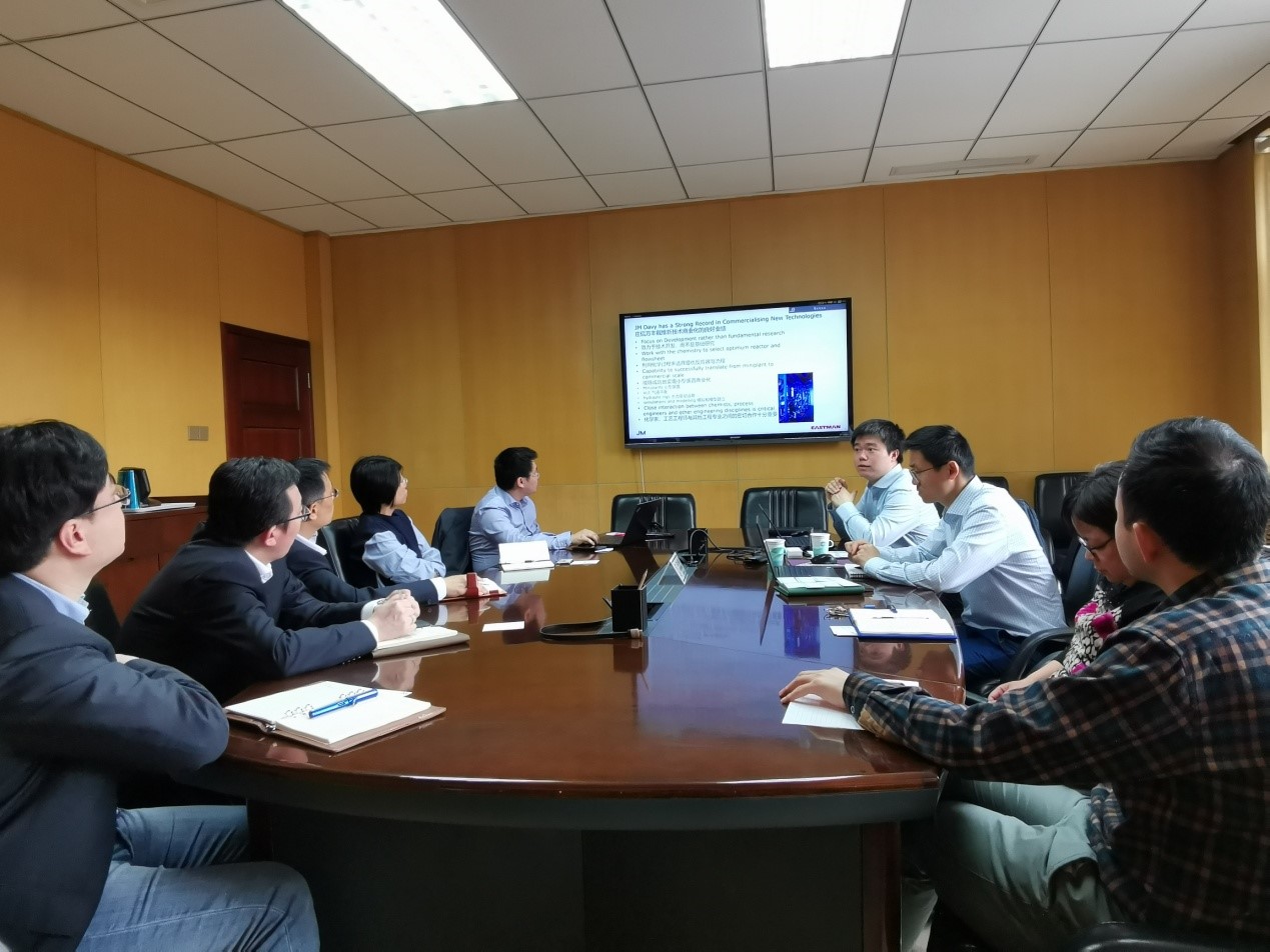 2019年4月23日,英國莊信萬豐戴維技術公司(JOHNSON MATTHEY DAVY)到訪我院,就該公司與美國伊士曼(EASTMAN)公司合作開發的合成氣經甲醇制乙二醇工藝技術開展技術交流。我院李志堅院長助理帶領能源化工處和材料化工處相關技術人員參加了交流。