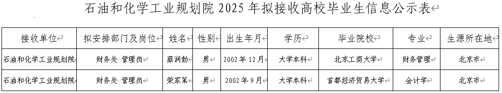 石油和化學工業規劃院2025年度接收高校畢業生2名,現公示如下,如有異議,請以郵件方式與我單位和上級單位聯系。公示時間為2025年7月1日到2025年7月7日(5個工作日)。